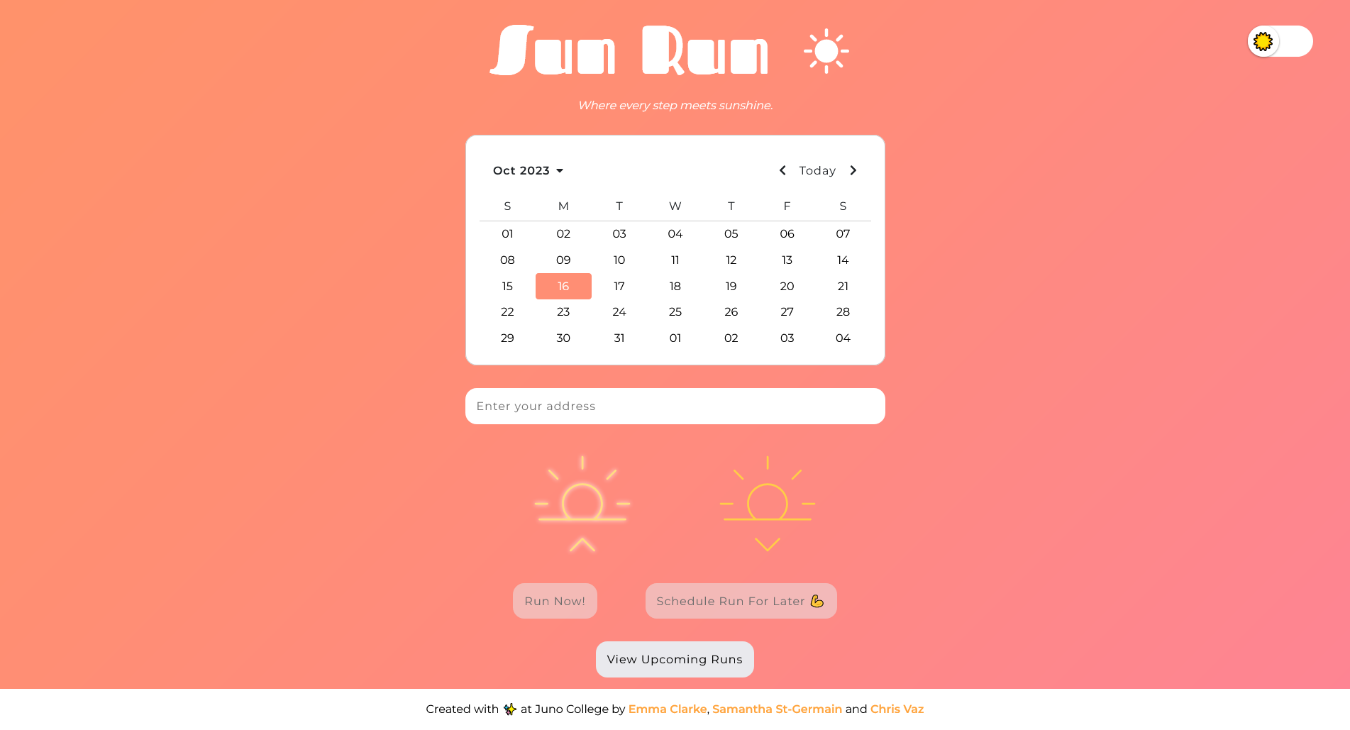 This app collects the user's location, converts it to longitude and latitude using reverse geocoding, and fetches sunrise/sunset data from the Sunset and Sunrise API. It also considers the user's desired run duration, distance, and time preference to suggest the best starting time based on available sunlight.